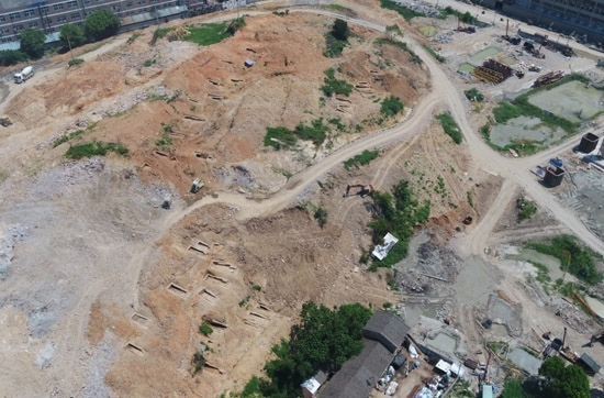 本次发掘的古墓群,汉六朝墓葬占绝大多数,其分布有明显特点,除少数散布于西、北面山坡外,多数墓葬选址于向阳的东、南坡,且大体呈三组排列。各组内墓葬大体先依同一高度横向排列,部分后葬者或前或后,避让有序,应为家族墓地。墓葬皆为土坑竖穴砖室墓,多数平面呈刀形和长方形,凸字形墓仅3座。刀形和凸字形墓室一般长度接近6米,宽1.5米以上,墓室宽敞,底砖铺成人字形,券顶以楔形砖夹带长方形砖构筑。构筑较考究。长方形墓室较小,一般长4米多,宽逾1米。墓砖一般长34,宽14.5,厚5厘米,两侧模印铜钱纹、青龙、白虎、鱼纹、人面、几何纹、花瓣纹等组合纹饰。部分在一侧印有 “咸康”、“咸和”、“宁康”、“元嘉”、“永明”、“升平”“永泰”等纪年。M13封门中还出有6块画像砖,在砖面上以细线划出女侍、飞仙等形象。