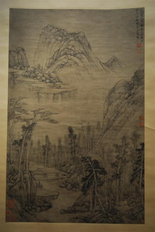 《水阁清幽图》珍藏于南京博物院,纸本,水墨,104.7×67厘米,上题:“大痴道人平阳黄公望画于云间客舍时年八秩有一。”