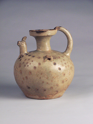 盘口,短颈,溜肩,圆腹,平底内凹;鸡首为流,引颈高冠,另一端有圆拱形把;左右侧有对称桥形耳。肩饰弦纹一道,腹及口沿饰褐色点彩,腹部点彩交错组成八组三角形区间,各区内又饰联珠形花团。胎骨灰白坚硬,施青黄釉,釉面匀净光泽,外不及底。