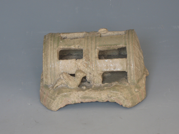 银锭形底座,上罩镂空半片筒形笼;两端平直,划饰斜方格纹;一端下开半片圆形门,另端密闭;笼内外各塑一鸡,顶部应塑有一鸡,胎呈淡灰白色,胎质细密。通体施淡灰绿釉,釉层薄匀。