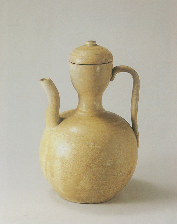 盖内有子口,柱钮,弧面。壶杯形口,细颈,球形腹,平底。肩部一侧置弧形长流,对侧置扁曲条形鋬,鋬上端与杯口相连,鋬面模印草叶纹。盖口沿和壶口沿各有二孔供穿绳系盖。胎呈灰白色,致密坚硬。通体施淡青黄釉,釉层匀净光亮,釉面开细碎纹片。胎釉结合紧密。