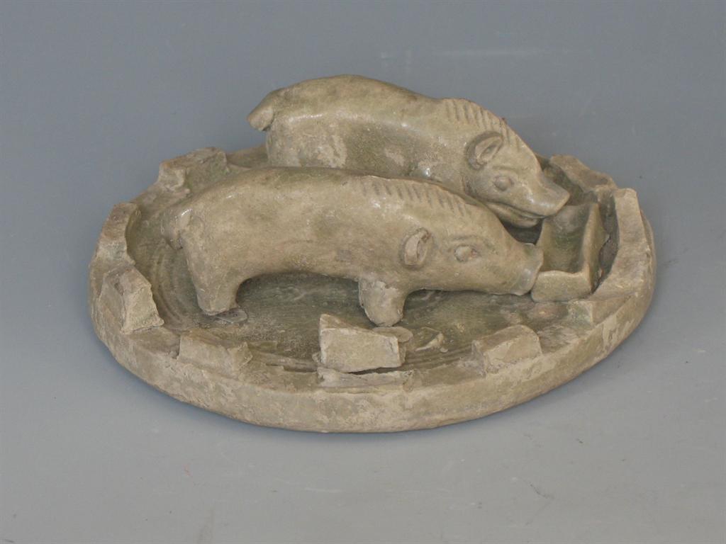 器呈圆形,周边设条形栅栏,内底饰二周弦纹。圈内饲二肥猪就食于长方形槽。猪耸鬃立耳,卷尾收臀,前腿分开,后脚蹬地,形象逼真,维妙维肖。胎呈浅灰白色,胎质细密。釉为淡灰青色,釉层略厚,胎釉结合紧密。