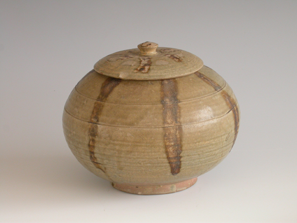 | 内容: | 整体呈瓜形。盖内有子口,瓜蒂形钮,弧面,钮饰褐色彩斑,盖面绘饰六条褐彩长条纹。罐敛口,圆鼓腹,假圈足,内凹底。上腹饰二道弦纹,下腹饰五道等距弦纹,整个腹部绘饰七条褐彩长条纹。胎呈浅灰色,致密坚硬。除底外通体施淡灰绿釉,釉层薄而光亮,底部无釉露胎处呈红褐色。该罐造型似瓜,褐彩装饰象征瓜皮纹,设计立意新颖;器表彩绘大面积褐斑,是研究瓯窑褐彩装饰演变规律的重要例证,为南朝瓯窑瓷器的上乘精品。 | ||