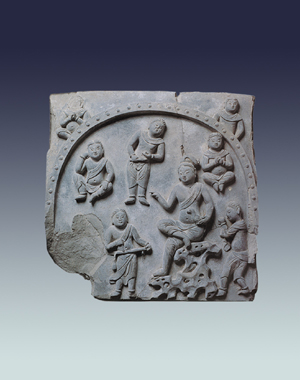 外有方框,内浮雕半圆形券门,门内浮雕尸毗王本生故事:王子上身半袒,肩披绶带,双目微闭,右手曲起,左手护被饿鹰追逐鸽子,准备施舍腿上肉。双腿相交,神情宁静。其旁各人神态各异,或敬仰,或惊异,等等。