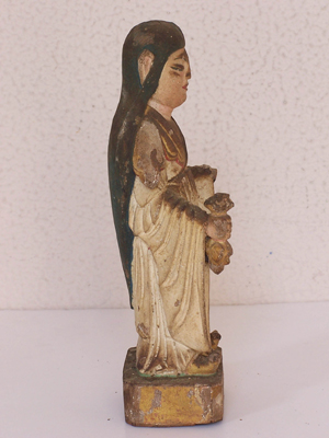 立像头披蓝色长发,脸部丰满皙白,弯月眉,双目低启,高鼻红唇。身穿乳白色大袖交领襦衣,披红底描金云肩,腰系帛带,足登云头履。右手持净水瓶,左手残。凝神伫立于座上。雕刻细腻,色彩鲜艳,衣褶纹饰雕刻流畅。