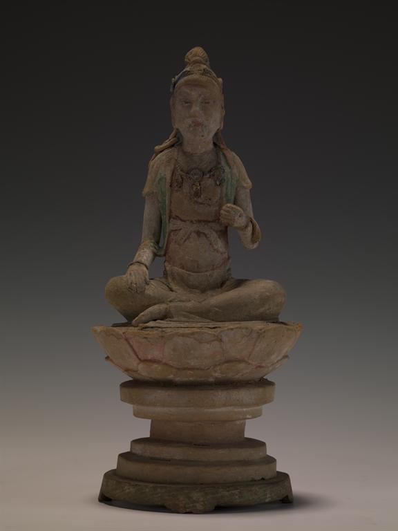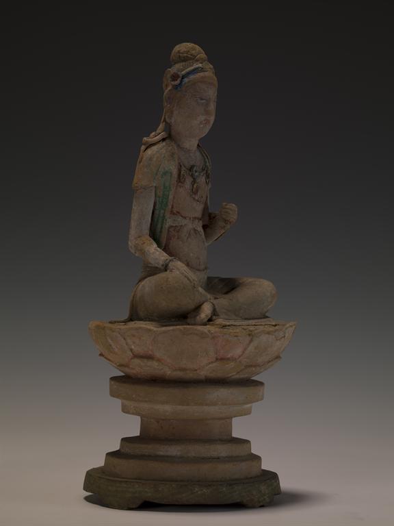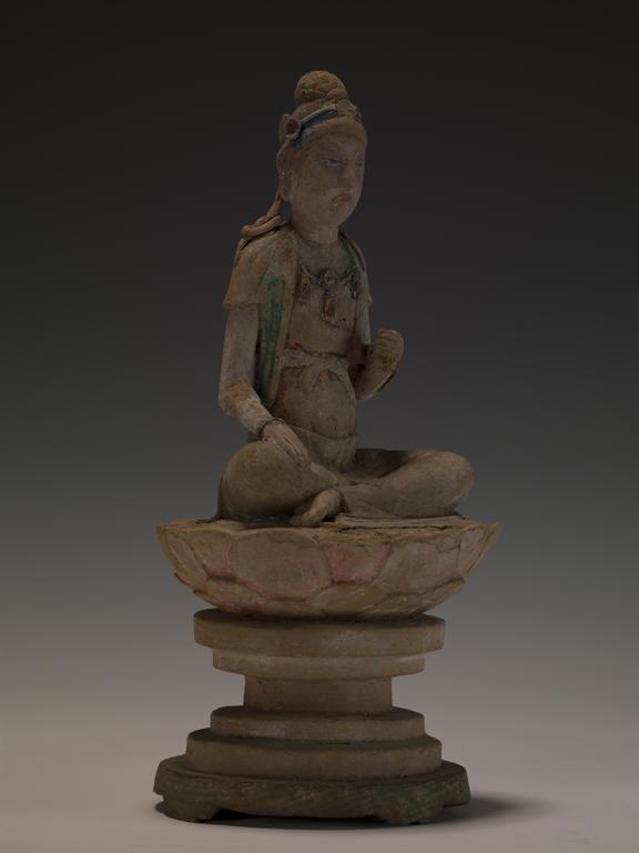 蓝色发髻,高髻,饰发箍,双耳后二绺垂髻披于肩上,宝缯下垂胸前。目秀眉翠,晕颊小口,面容姣秀。项饰金璎珞。身穿赭红色襦衣,右胸袒露,肌肤洁白柔润。肩搭石绿色披巾,腰系罗裙,外围腰袱,束以结带。左手曲起,右手置膝,臂、腕戴环钏。跣足,结跏趺坐于仰莲须弥座上。彩塑线条明快流畅,色彩浓艳,各部比例准确,人物神态闲适自若,具有北宋造像世俗化的特点。代表了北宋时期和温州地方工艺特色。