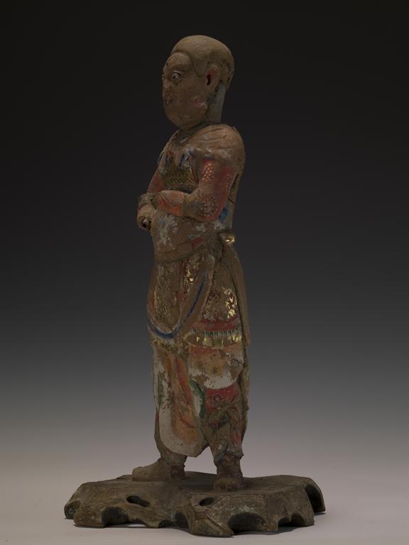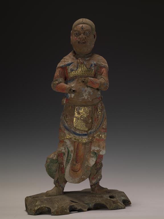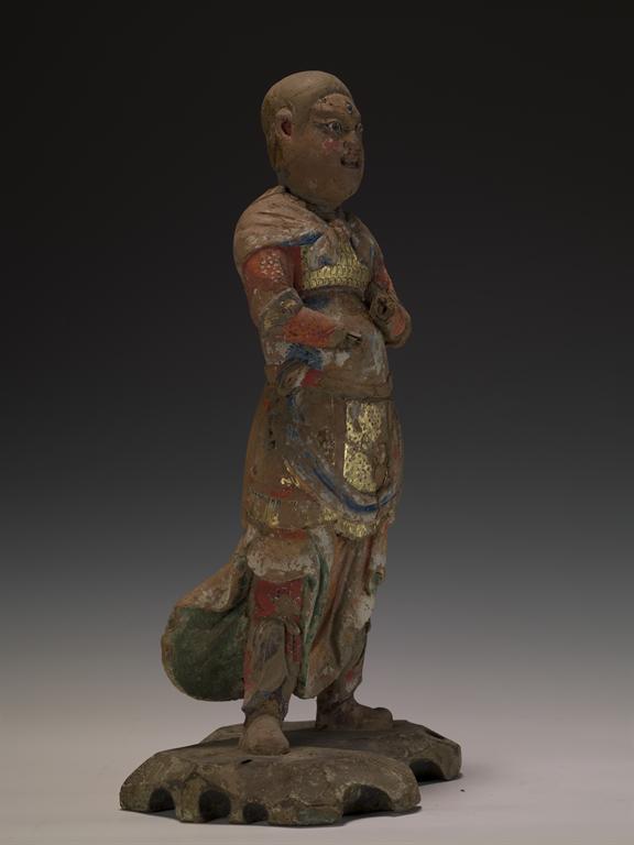 白象塔二层三面出土。 披齐腰红色长发,面呈赭红色,有三目,蹙眉暴睛,张口露齿。肩披蓝白相间巾,颈下束结,着红底蓝白团花窄袖袍,外罩赭红色贴金箔鱼鳞甲,胸部用帛带横束,腰腹围蓝色团花捍腰,腰系革带,腹前饰金底红色团花鹘尾。肘部缀以象伞一样撑开的护甲残缺。下身着红底团花腿裙,红底护裙饰金色草纹,下着红底蓝白团花缚口裤。两手残缺,两足着靴,神态威武。彩塑线条明快流畅,色彩浓艳,各部比例准确,具有北宋造像世俗化的特点。代表了北宋时期和温州地方工艺特色。