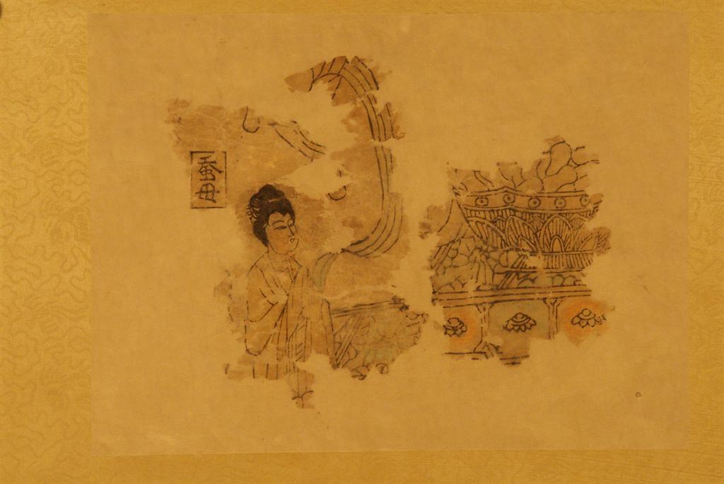 | 形态特征: | 套色版画《蚕母》残高约21、残宽约19厘米,阳文刻版,用浓墨、淡墨、朱红及浅绿四色印在质地柔软的纸上。画面以蚕母、蚕茧和吉祥等图案为主,较为完整地反映了北宋时期蚕神的形象和蚕茧丰收的情景。画面左上方的长方形字框内刊有直书'蚕母'两字。左侧为蚕母立像,头梳高髻,髻上插花;面颊丰满圆润,白皙而带红晕;柳眉清秀,双目深沉,晶莹内涵,容光照人。身着宽袖对襟鞠衣,肩搭浅绿色帛巾,双手平举,姿态落落大方。帛巾随风飘动,曲卷上升,间衬飘浮状蚕茧两颗,以示衣着来自蚕丝。画面右侧有蚕茧满筐,形象逼真。筐外沿设圆珠带点纹一周,筐壁围有重瓣莲花纹,筐外有一束花在朱色衬地上盛开。画面下设横向吉祥开框图案四组,一为荷叶,另三为宝相花。框内套色,从左至右,单数为淡绿色,双数为朱红色。'蚕母'高髻、鞠衣,形体雍容丰满,颇具晚唐五代遗风。该版画用刀稳定、准确,衣纹、帛巾线条刚劲,多以长线直笔,随势落刀,爽快利落;蚕筐和吉祥图案则用短线和粗犷的刀法,既有轻重之分,又有顿挫之别。在色彩运用上,以黑、朱、绿三色为主调,头发用浸润浓墨,效果轻柔松软,光泽细腻;衣纹用细匀淡墨,转折处若断若续,富有节奏感;帛巾、对襟的淡绿色调,则与吉祥开框图案。 | ||