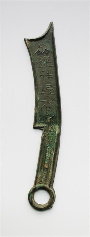 俗称“六字刀”,是战国时期齐国大型刀币之一,与小型的齐明刀的换算关系是1:30,存世量极少。形如刀削,略尖刀首,凹刃,圆弧刀身,直柄,圆形刀环。边郭高高隆起。刀柄有两道平行线纹,背面靠刀首端有三道平行线纹。正面“齐返邦长法化” 篆书六字,一气呵成,笔划如行云流水般浅细流畅,伸展自如。背文“日”字。色黑如漆,铸造精美。