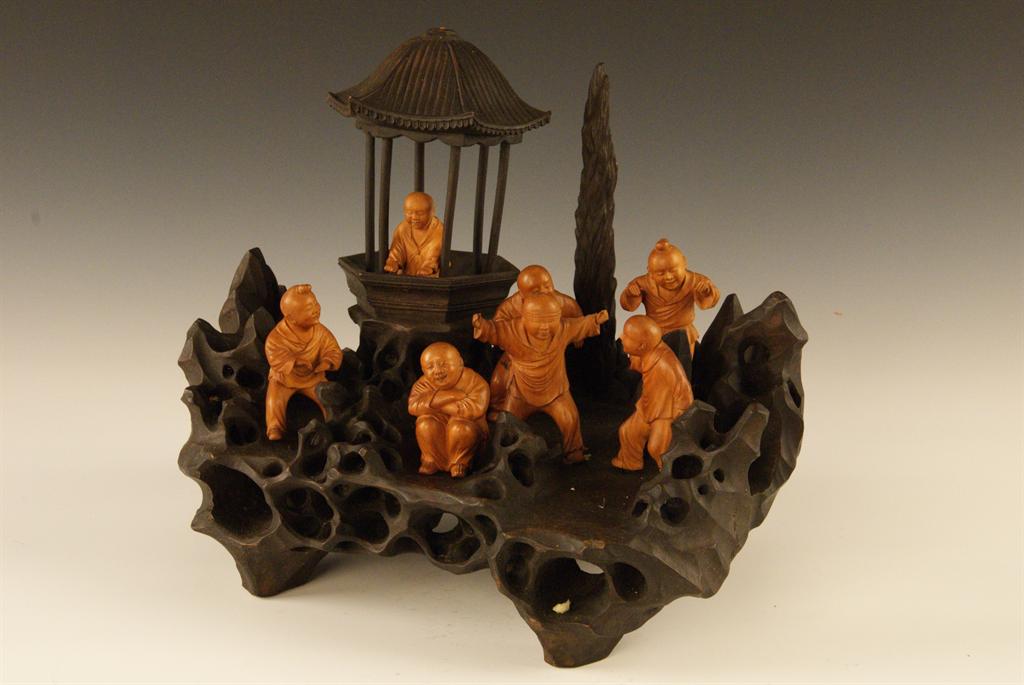 | 形态特征: | 樟木雕刻园林为座。园林以假山为主,六角亭雄踞山颠,玲珑剔透太湖石布置四周,右侧一鬆皮石挺立一方。黄杨木雕七小孩嬉玩捉迷藏。空地上有一孩蒙目伸臂,欲捕捉他孩,一孩隐匿于石旁,近处有一孩忍息躲避,亭中有一孩跪栏观望,其余三孩作随机应付。雕像与座用铁质铆钉连接固定。形象逼真,形态各异。是朱子常的代表作。 | ||