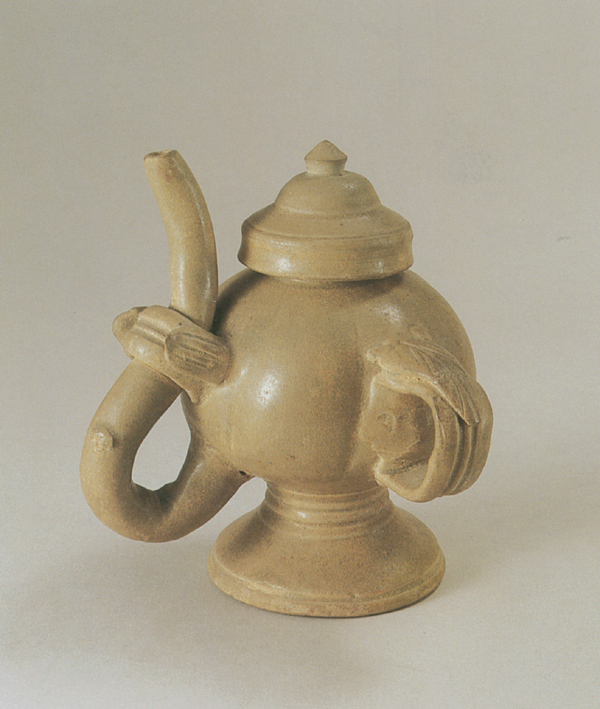 内容: | 斗笠形盖,母口,顶有小圆钮。壶直口,八瓣瓜棱球形腹,喇叭形高圈足。腹部一侧置圆曲长流,流口高过盖顶,流穿过一与腹部相接的圆环,圆环外堆塑两手呈合抱圆环状;与流成直角处置圆形宽鋬,鋬上端堆塑一蝉,鋬面饰二道弦纹。盖口沿与壶口沿各有一孔供穿绳系盖。胫部饰四道弦纹,圈足端饰一道弦纹。胎呈灰白色,致密坚硬。通体施青灰泛黄色釉,釉面匀净,略富光泽。该壶造型新颖独特,妙趣横生,是五代瓯窑瓷器的上乘精品。 | ||