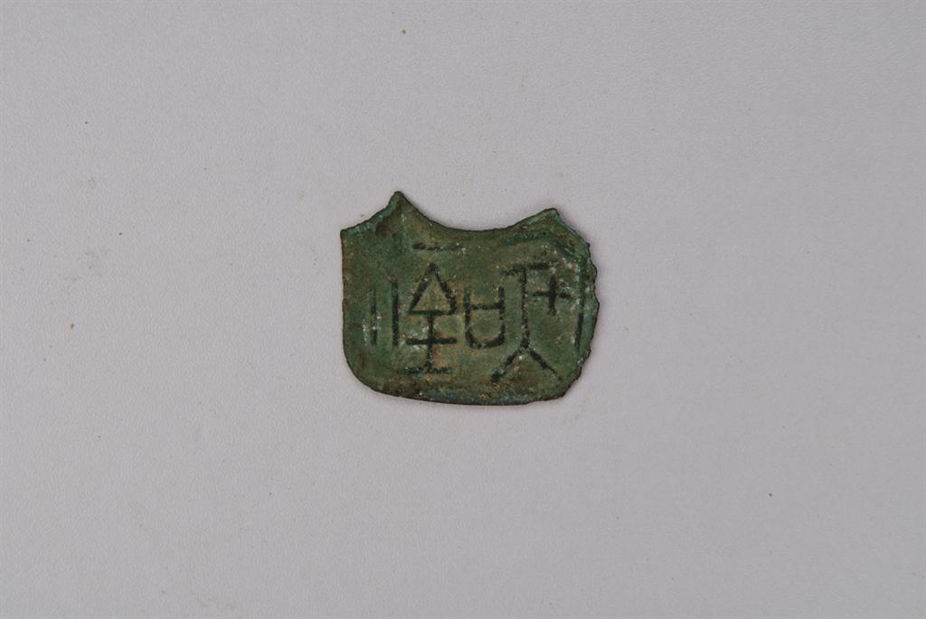 残缺。无首,圆弧肩,无足,弧档。面背皆无周郭和纹饰。面倒书'虞一釿',顺读。背无文。布身扁薄,青铜质地较差,锈蚀严重。