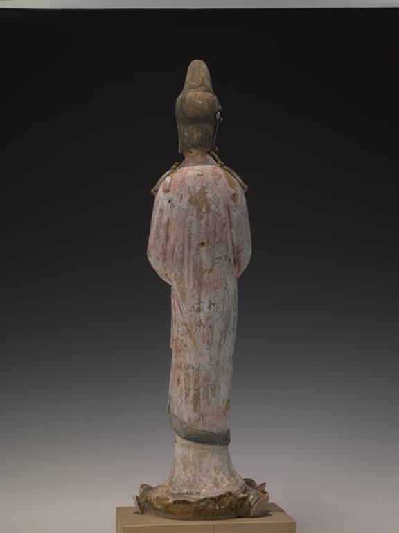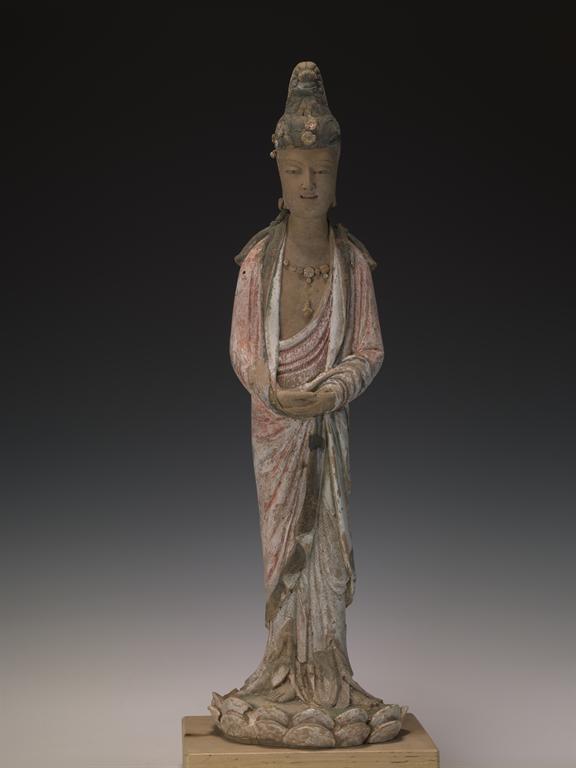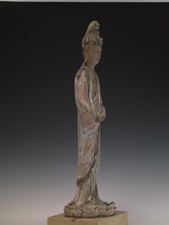 | 形态特征: | 白象塔一层四面出土。石绿色高髻,华冠,双耳垂肩,耳后二绺垂髻和缯带披垂于肩上。眉清目秀,面部丰腴。身穿大红描金菱格纹覆肩襦衣,右胸袒露,外披赭红色袈裟;项饰璎珞,双手相插腹前,下着白色菱格纹罗裙。跣足。亭亭玉立于仰莲上。菩萨体态轻盈,神态闲适自若,各部分比例适度,透视准确,线条圆润流畅,表现了典型宋塑特征。是这批彩塑中的精品。与收藏于省博物馆的彩塑立像(出土编号:137)为一对。 | ||