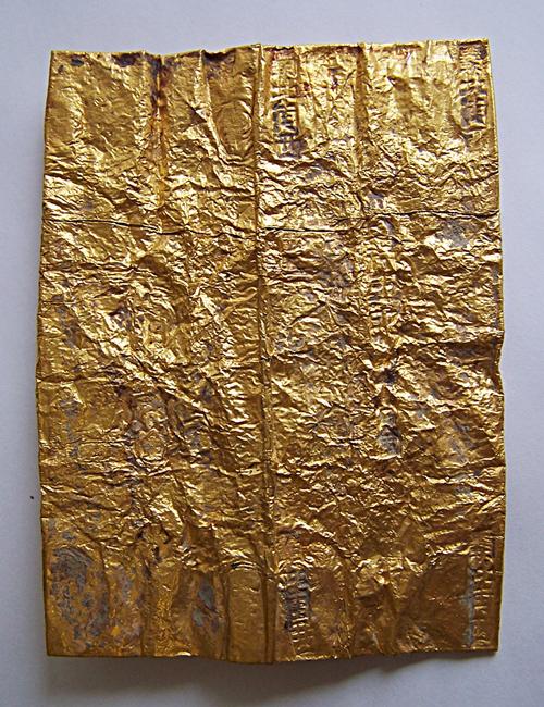 | 内容: | 正面朝背面沿边折叠。正面右半四角各有一处宋体阴文“霸北街西” 戳记,中央有一处文字“韩四郎十分金”戳记;左半右角有两处“霸北街西”印痕。背面无字,但有“霸北街西”和“韩四郎十分金”印痕。金叶子货币是南宋货币中的贵族,存世量极罕。该金叶子出土地点在市区水仓巷,在五马街以南的小南门一带,南宋时期已比较繁荣 | ||